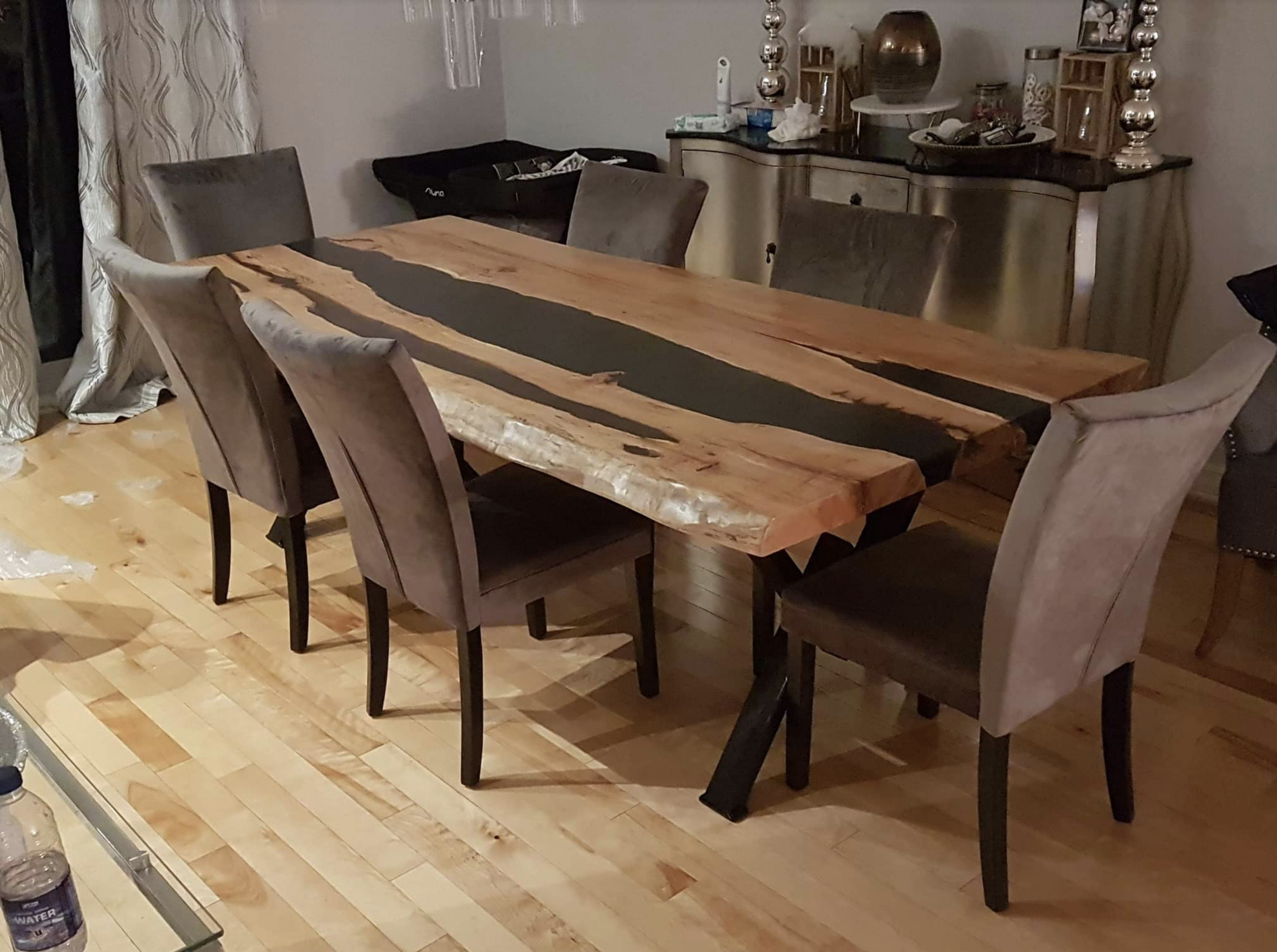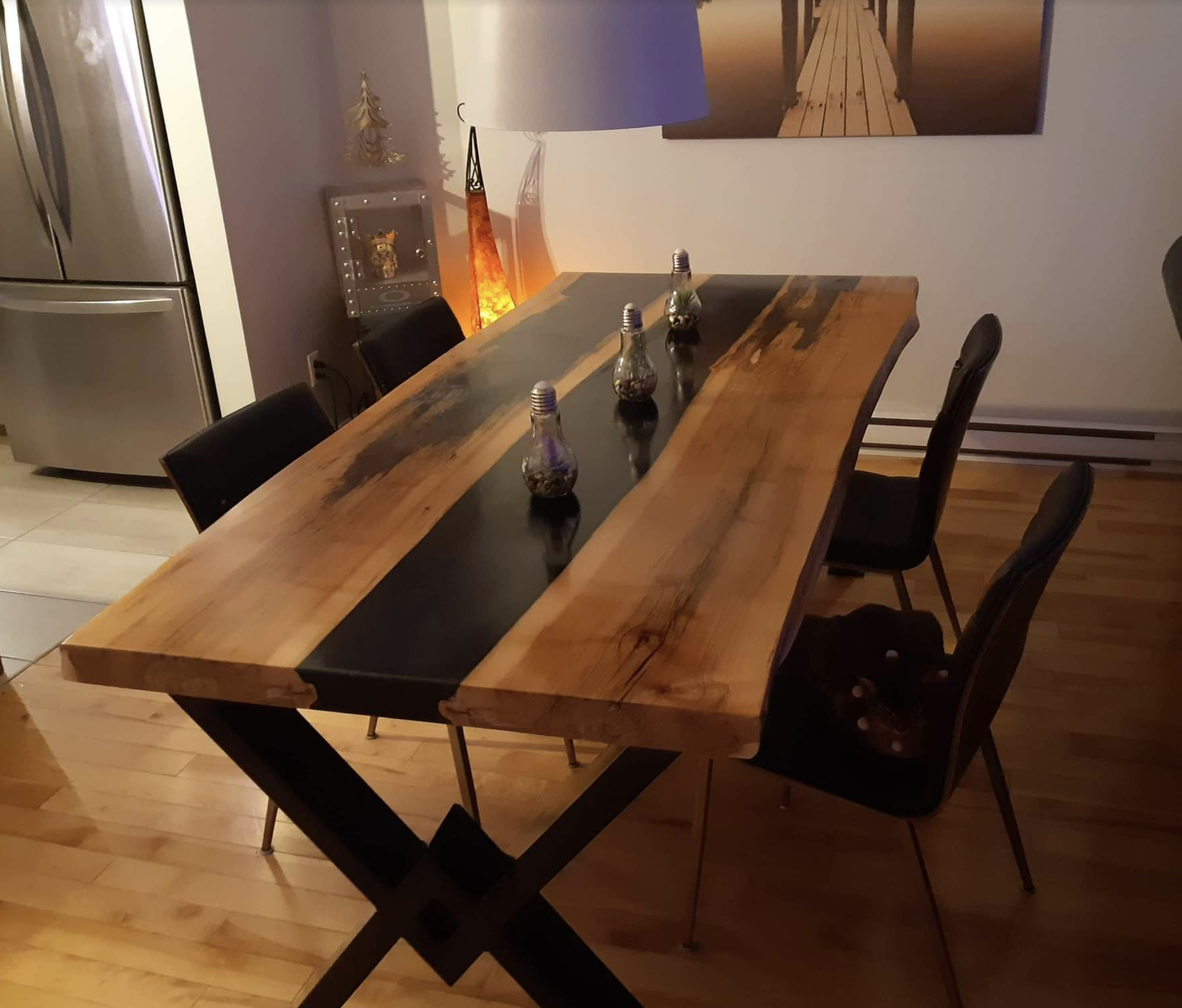 La table est juste incroyable! L’aspect du bois et de l’epoxy agrémente grandement la pièce! Sans doute le meilleur achat pour ma salle à manger, elle vole le punch 😂🥰